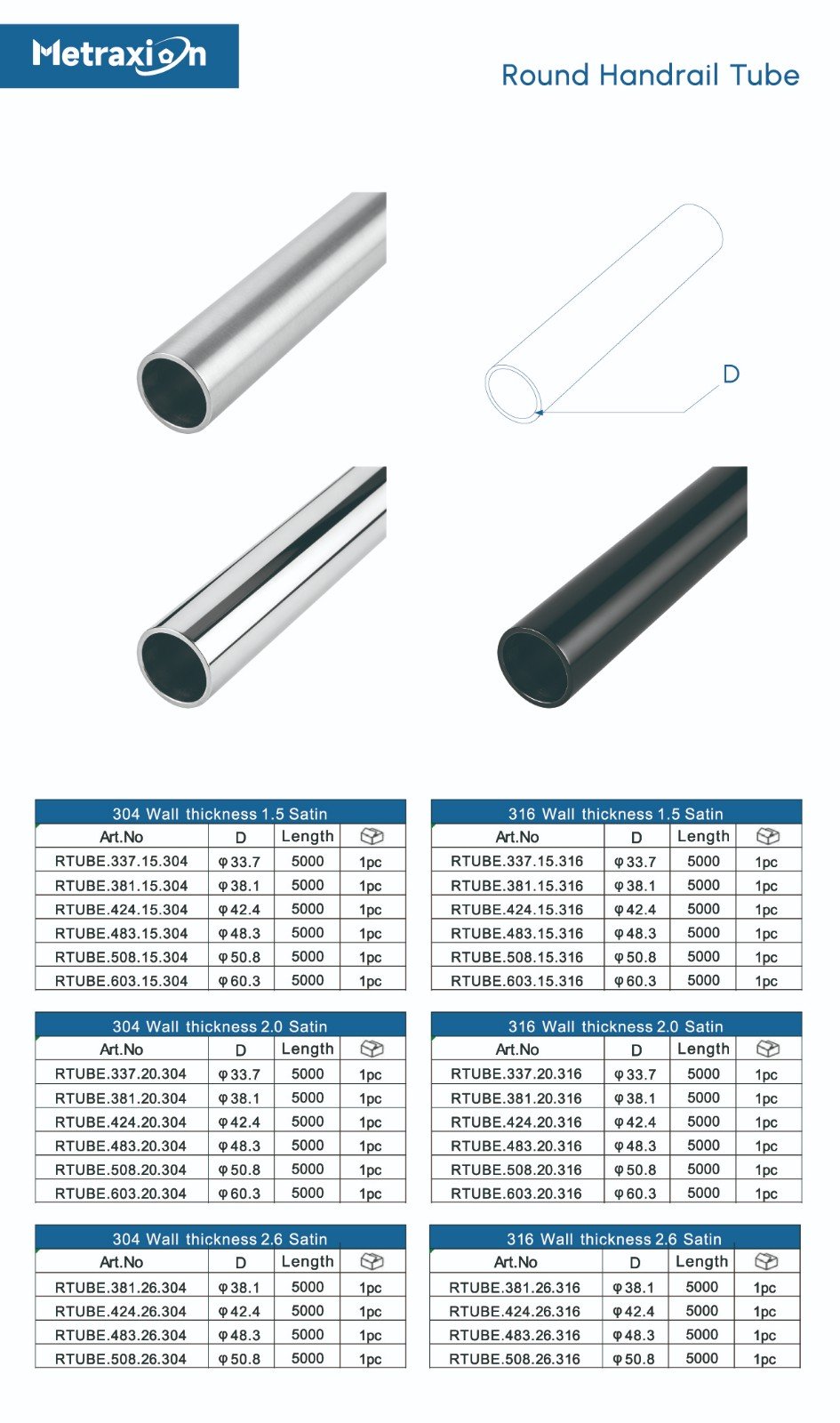 This Stainless steel round handrail tube, featuring a smooth surface and polished edges for easy cleaning, effectively prevents fingerprint marks.